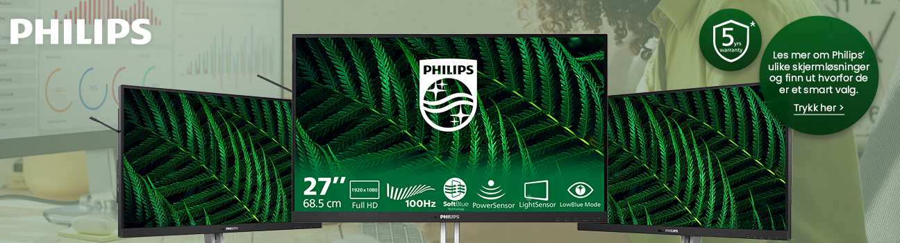 Bærekraftig teknologi handler ikke om perfeksjon – det handler om fremgang. Selv om ingen nytt IT-utstyr kan være fullstendig bærekraftig, er Philips-skjermer utviklet for å være mer energieffektive, ha lengre levetid og være ansvarlig sertifisert. Det gjør dem til et smart valg for bedrifter og profesjonelle som ønsker å redusere både energiforbruk og elektronisk avfall – uten å gå på kompromiss med ytelse.