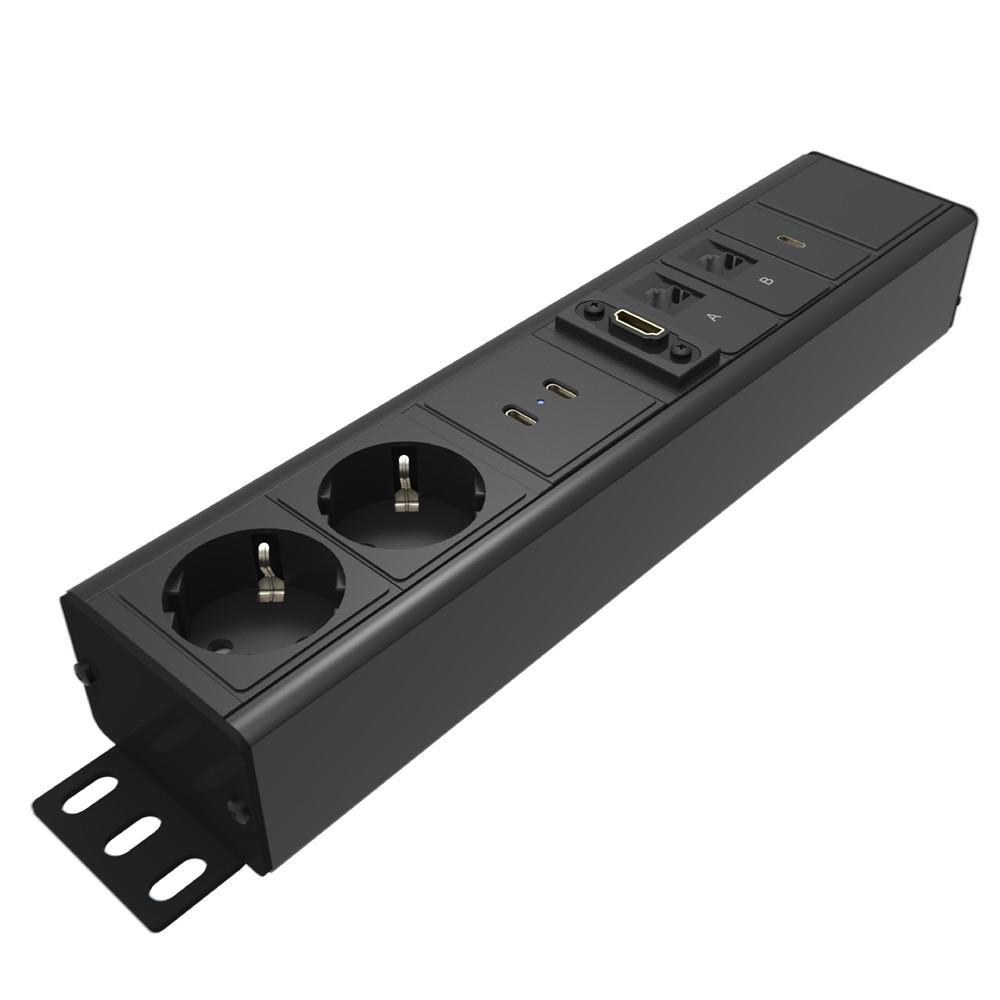 Outlet strip with 2 x power sockets (type F), 2x USB-C charger with max 30W , 2x data ports (RJ45), 1x USB-C data port and 1x HDMI. Ideal for daisy chain. The outlet is easily mounted on the bottom of e.g. a cable tray.