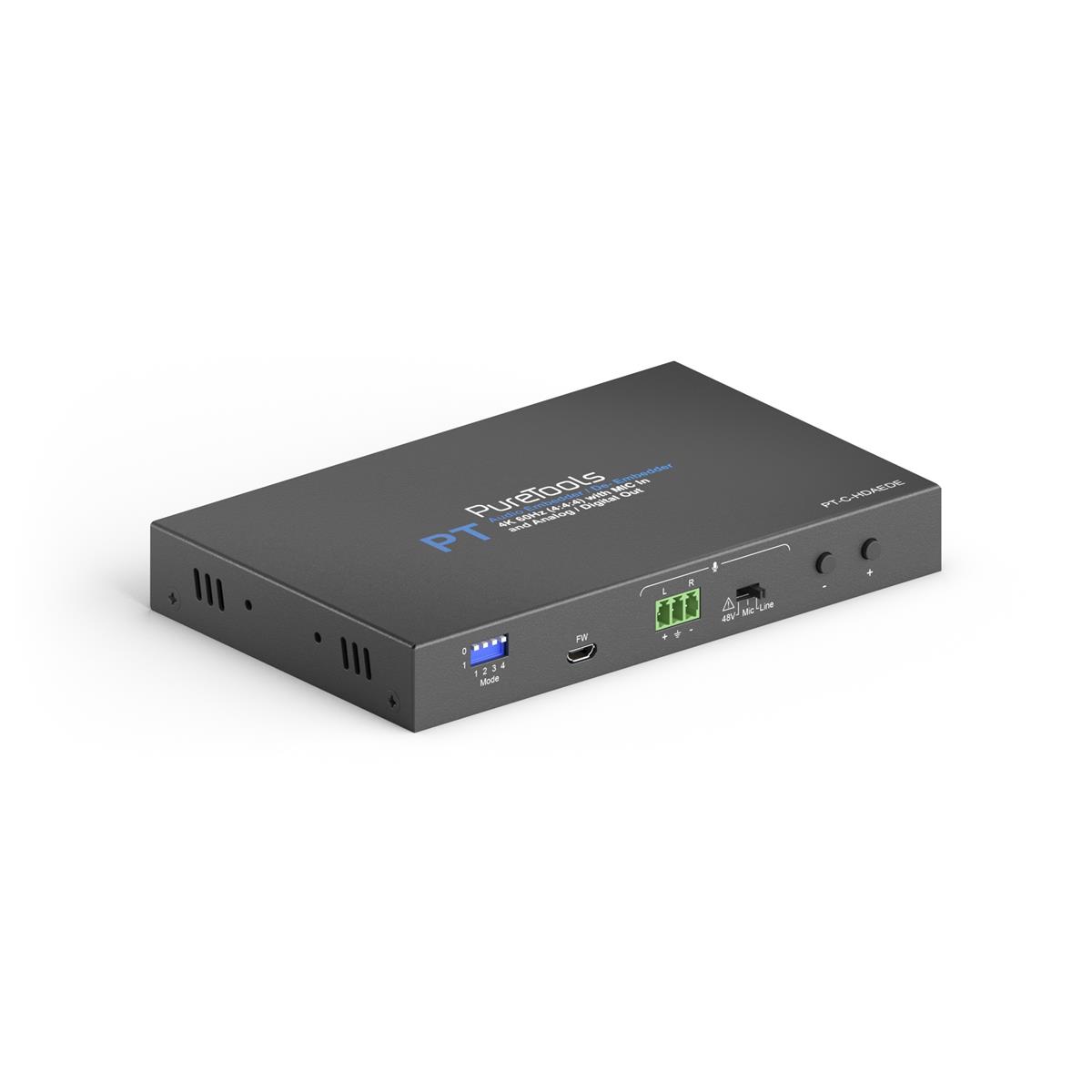 The PT-C-HDAEDE is an HDMI 2.0 Audio De-Embedder and Embedder which allows for a multitude of complex audio manipulations and therefore is suitable for private home cinema applications as well as professional high-end installations. It supports the full HDMI 2.0 bandwidth of 18Gbps at the HDMI input / output and can output the HDMI audio signal in digital as well as analog format. At the same time, an analog audio signal (Line / Mic / Mic with 48V phantom power) can be embedded and mixed with the HDMI audio, or replace it completely. ARC signals are also transmitted in the reverse direction via HDMI. The integrated downscaler converts 4K resolutions down to FullHD / 1080p, thus making the system compatible with older display devices.