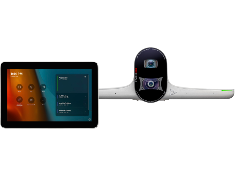 Poly Studio Room Kits for Microsoft Teams Rooms on Windows deliver a simple, clutter free user experience with brilliant video and audio features for focus rooms all the way up to large boardrooms. All-in-one video bars free up the conference table surface especially in smaller rooms, while the tabletop touch controller connects to the dedicated collaboration PC securely stowed in the cabinet or on the wall with a single cable.
