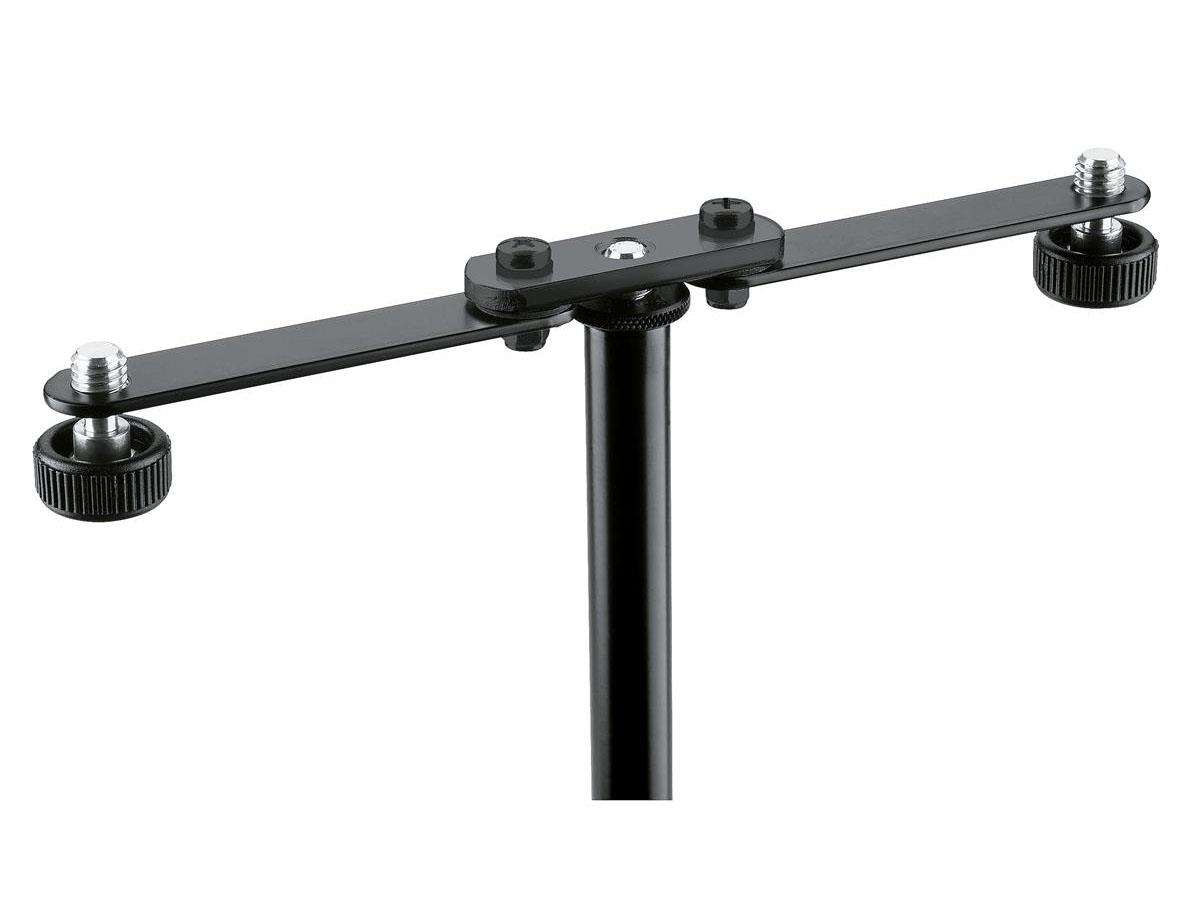 Special features: moveable bars on both sides to position the microphone; no parts to lose; connects to top of mic stands with 3/8" thread