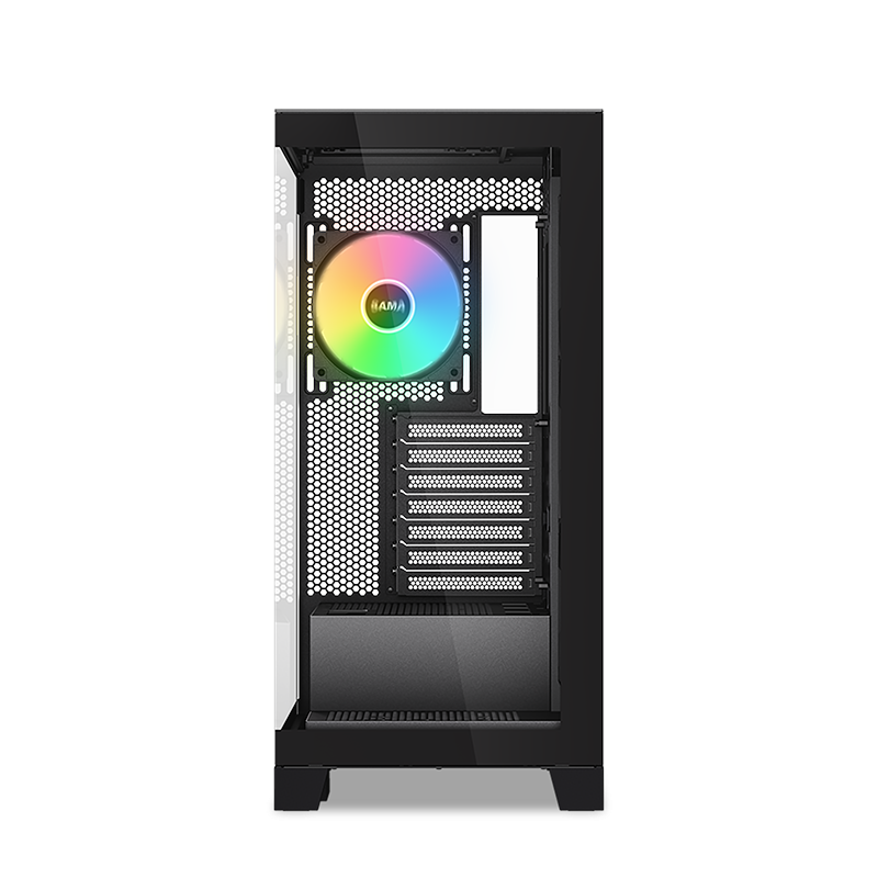 The SAMA V50 boasts a stunning design with two tempered glass panels and a removable front pillar, offering a seamless 270°panoramic view that beautifully showcases your build.