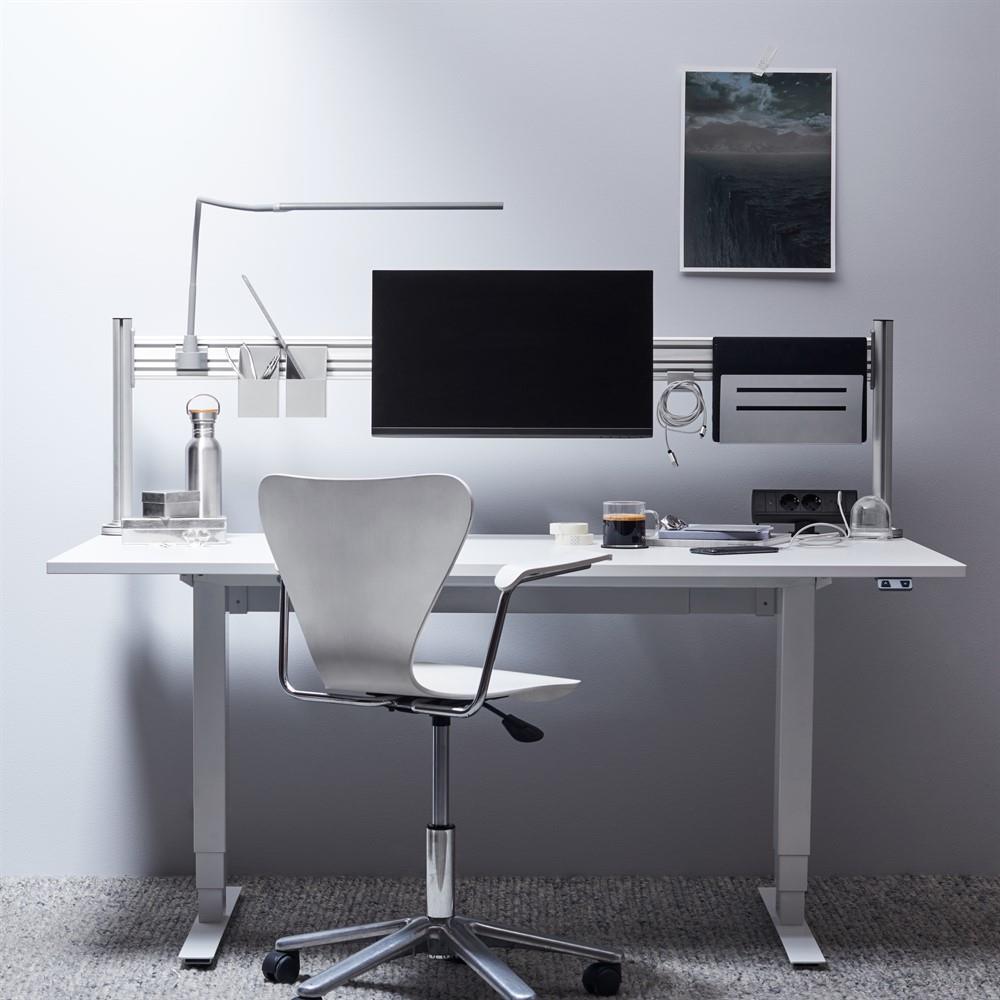 Deliveres complete with single rail of 1450 mm and 420 mm poles and brackets for desk mount less 25 mm.