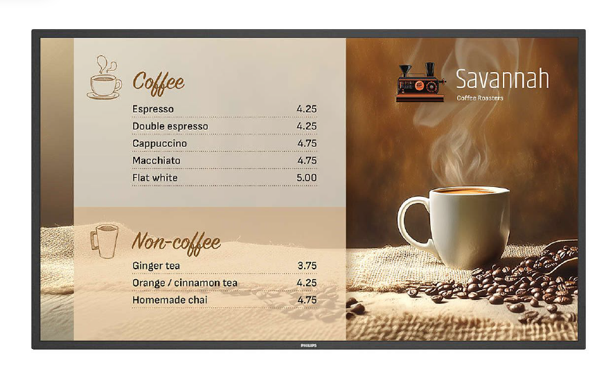 Outperform in challenging environments with the robust 24/7 Philips Signage 6000 Series. With enhanced brightness up to 800 nits and an option to add Philips Wave remote management, ideal for kitchens through to transport hubs and beyond.