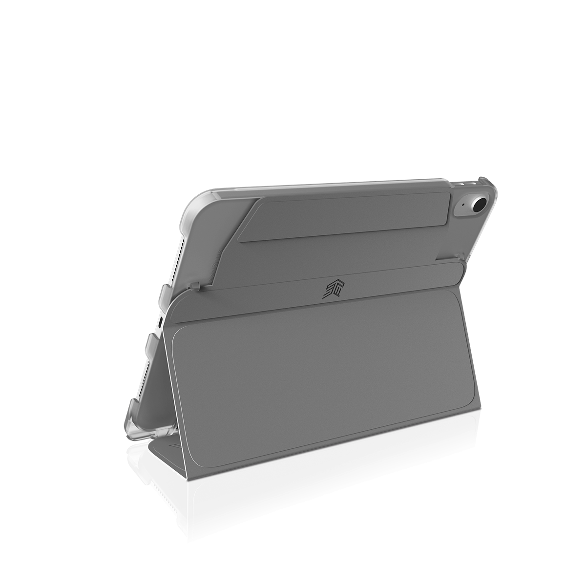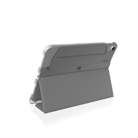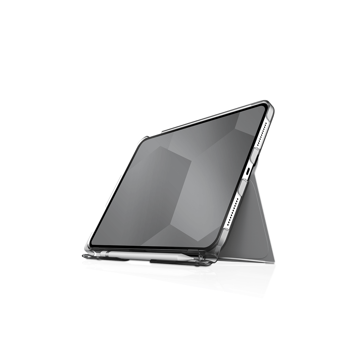 The Studio protects your iPad with a transparent polycarbonate crystal clear bracket. The patented magnetic cover effortlessly folds into a stand for typing and viewing ease.