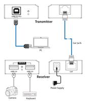 - Applications: The transmitter is connected to the USB-B port of a PC or laptop. The receiver connects to up to two USB devices such as, mouse, keyboard, touch screen or camera etc.