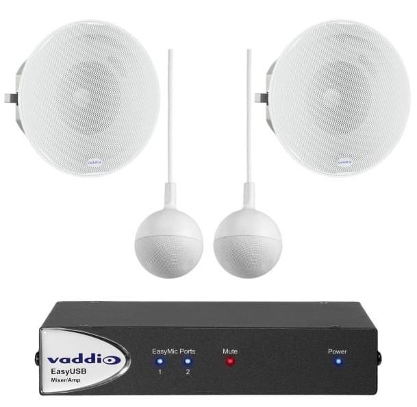 An audio conferencing solution for medium rooms using PC-based unified communication applications that require ceiling installation. Both microphones and speakers are recessed in the ceiling. Includes two CeilingMICs for extended coverage within the room and two Vaddio Ceiling Speakers to maximize sound distribution within the room.